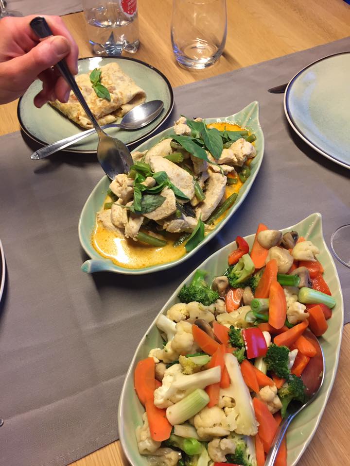 Gevulde omelette Rode curry Gewokte groenten Thaiathome Overmere Eerst de curry of eerst de groenten?