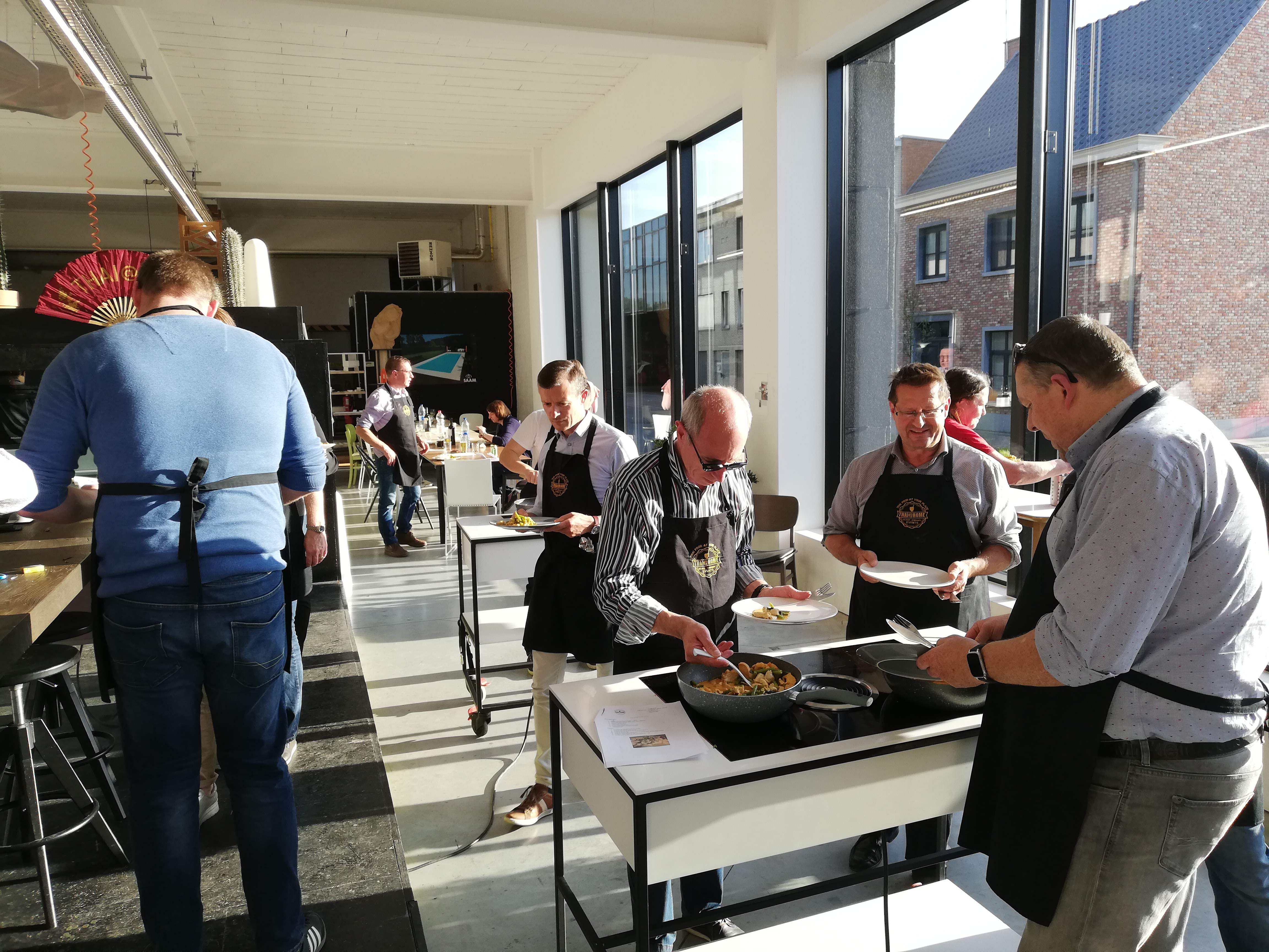 Special groepsevent voor bedrijf met de Thaise keuken van Thaiathome Proeven van wat het team gemaakt heeft Foto van mensen die eten opscheppen