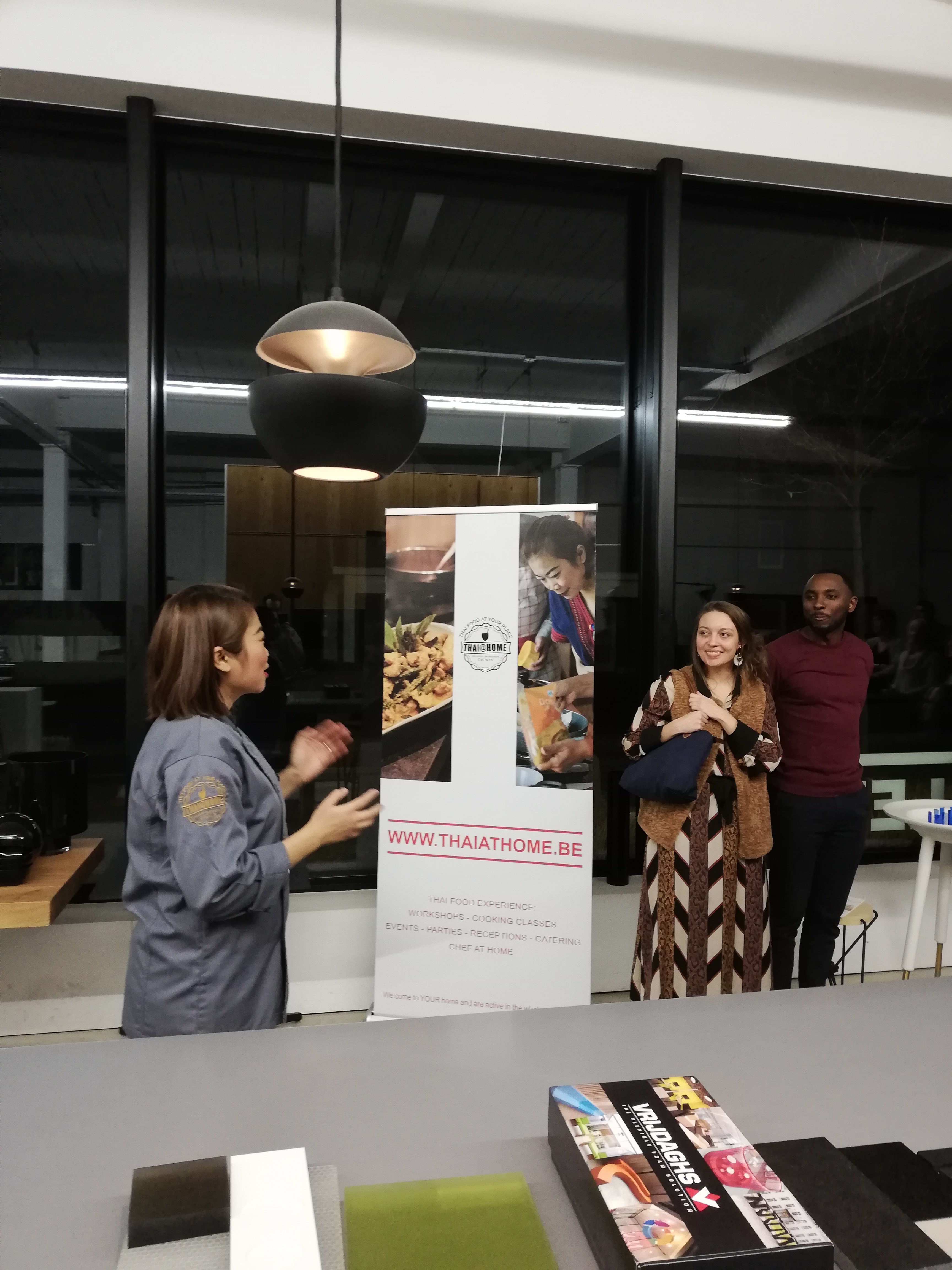 Ontvangst voor het bedrijfsevent met een Thaise kookworkshop Welkom op de workshop Foto van koppel dat toekomt op de kookworkshop