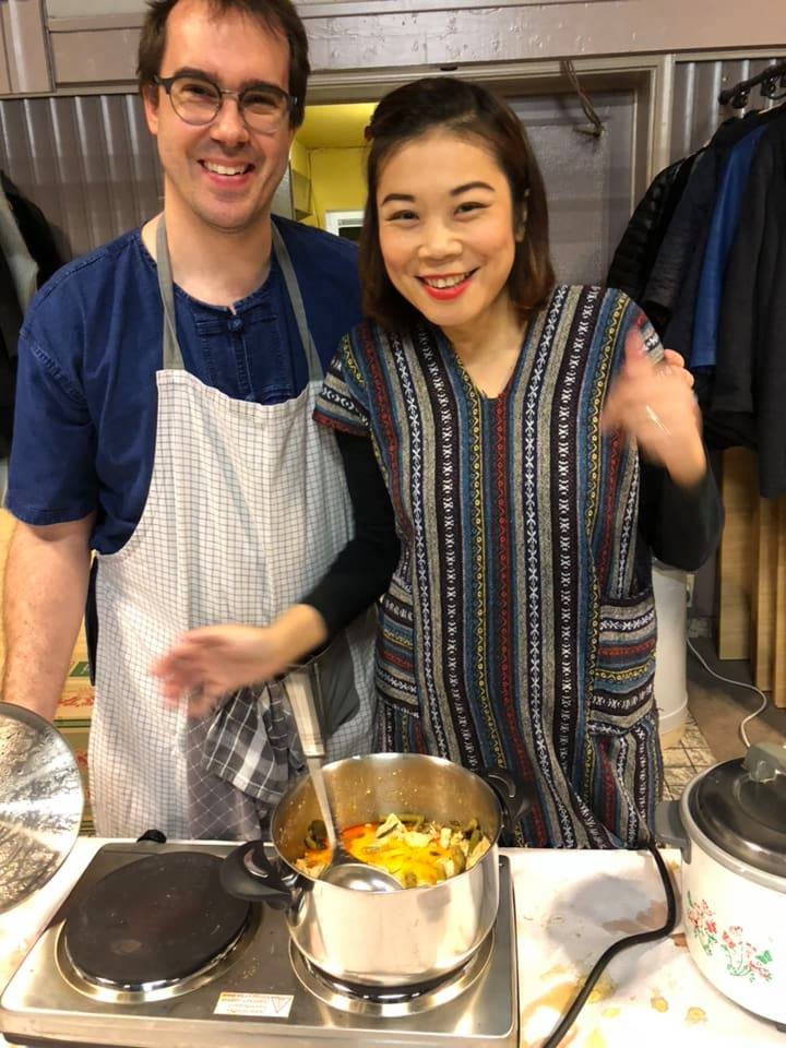 Thai@Home team is klaar voor het Thais koken in Kruibeke, Antwerpen Lachen voor de camera Foto van Thaise dame en Belgische man die koken