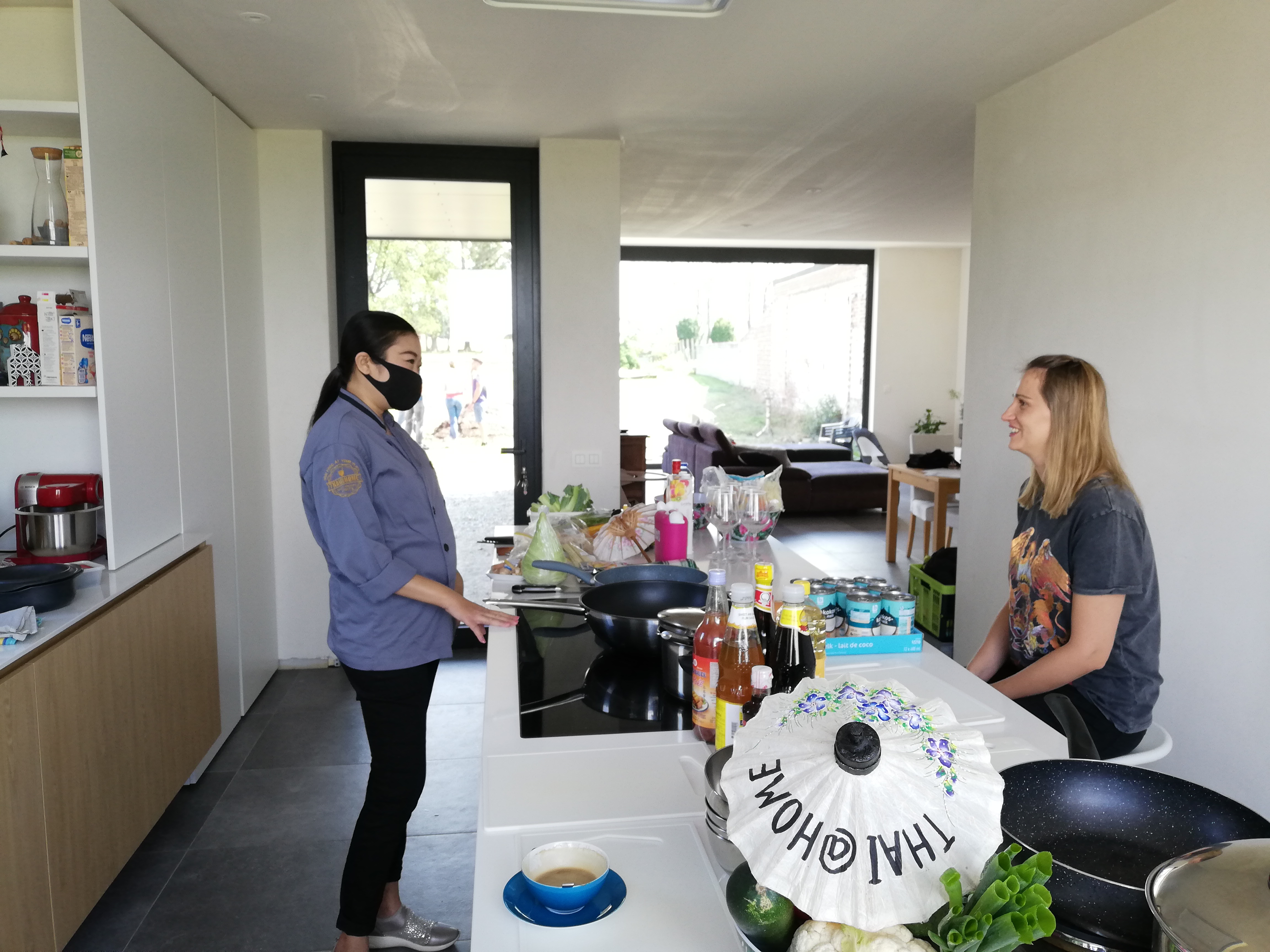 Kookworkshop met de regels van social distancing gerespecteerd bij jou thuis Foto van Thaise chef met mondmasker