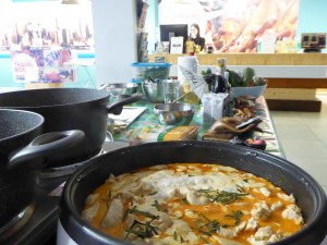 Kookshow in de winkel van Connections te Gent opendeurdag De curry is bijna klaar Foto van een kookpot met rode Thaise curry