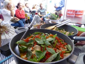 Thaise rode curry met Thaise zoete basilicum tijdens opendeurdag Mag het een beetje pikant zijn? Foto van een Thaise rode curry met kip