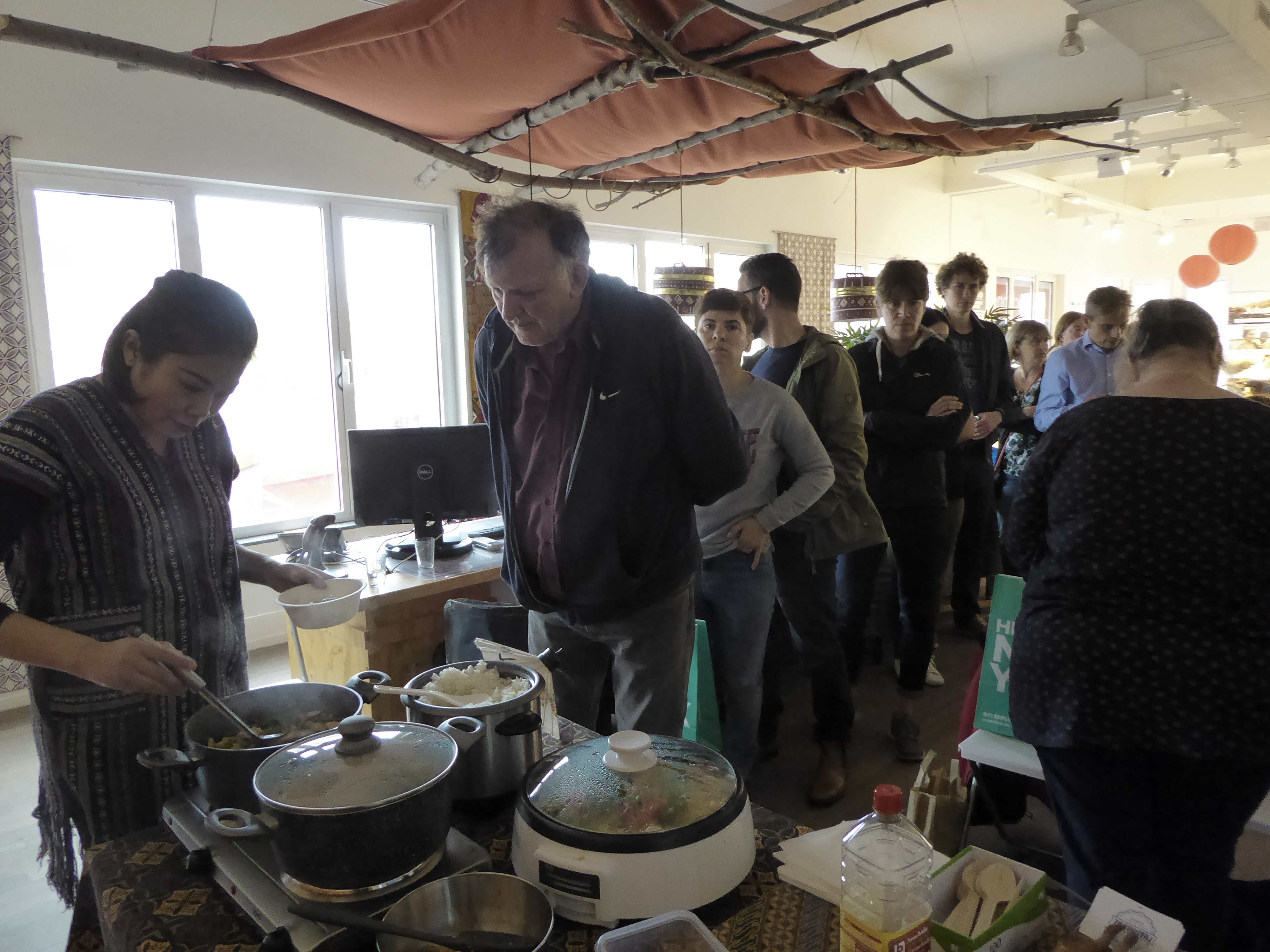 Thaise rode curry op informatiedag van reisagent met kookpresentatie Go go Nokkie, je kan het Foto van mensen die aanschuiven voor een Thaise rode curry