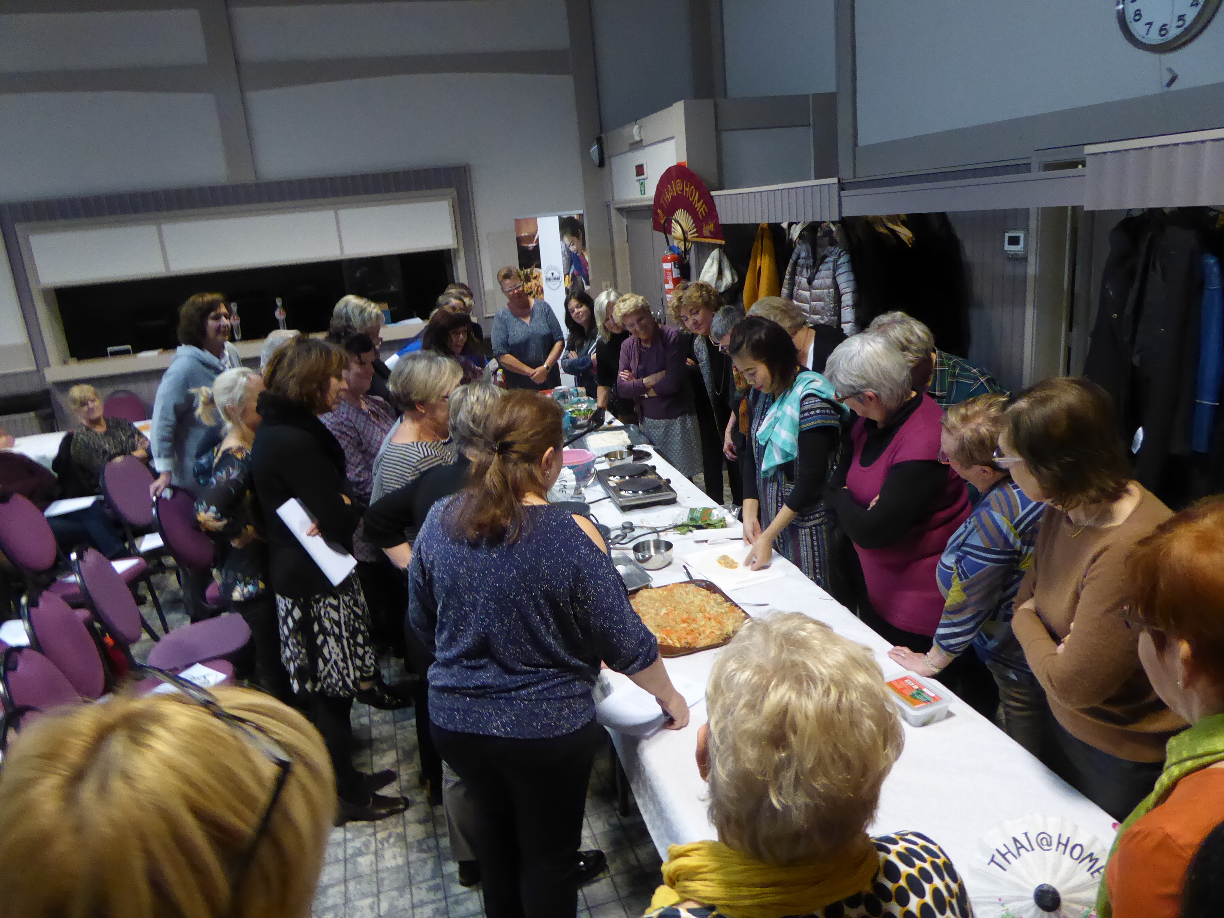 Loempia’s maken tijdens de kookdemonstratie op een vrouwenavond leren we Thais koken Chef Nokkie toont het even voor Foto’s van Thaise kookpresentatie