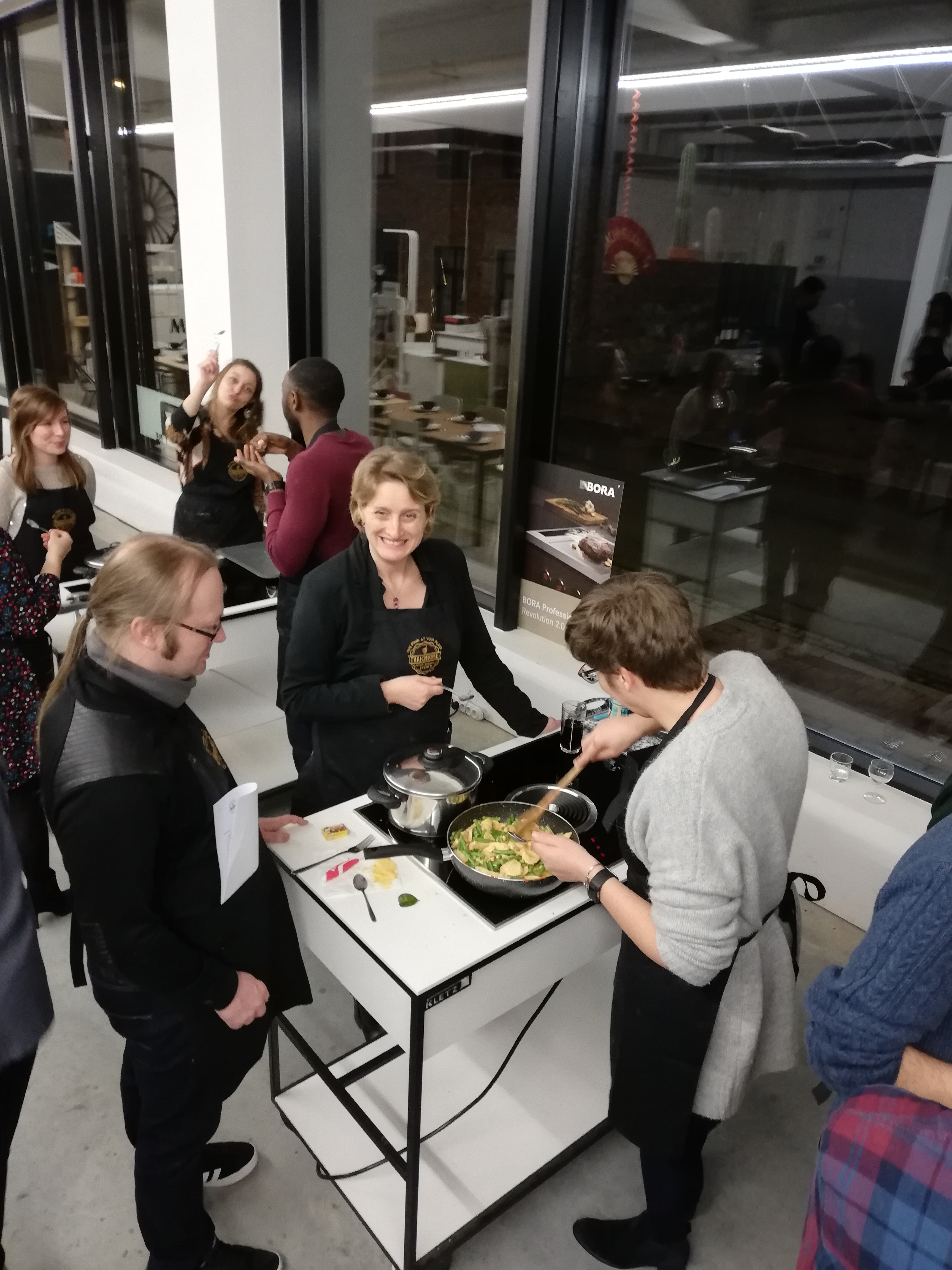 Avondfeest voor bedrijf Brady met de collega’s van heel Vlaanderen en ver daarbuiten Samen koken is plezant Foto van groep lachende mensen die Thais leren koken