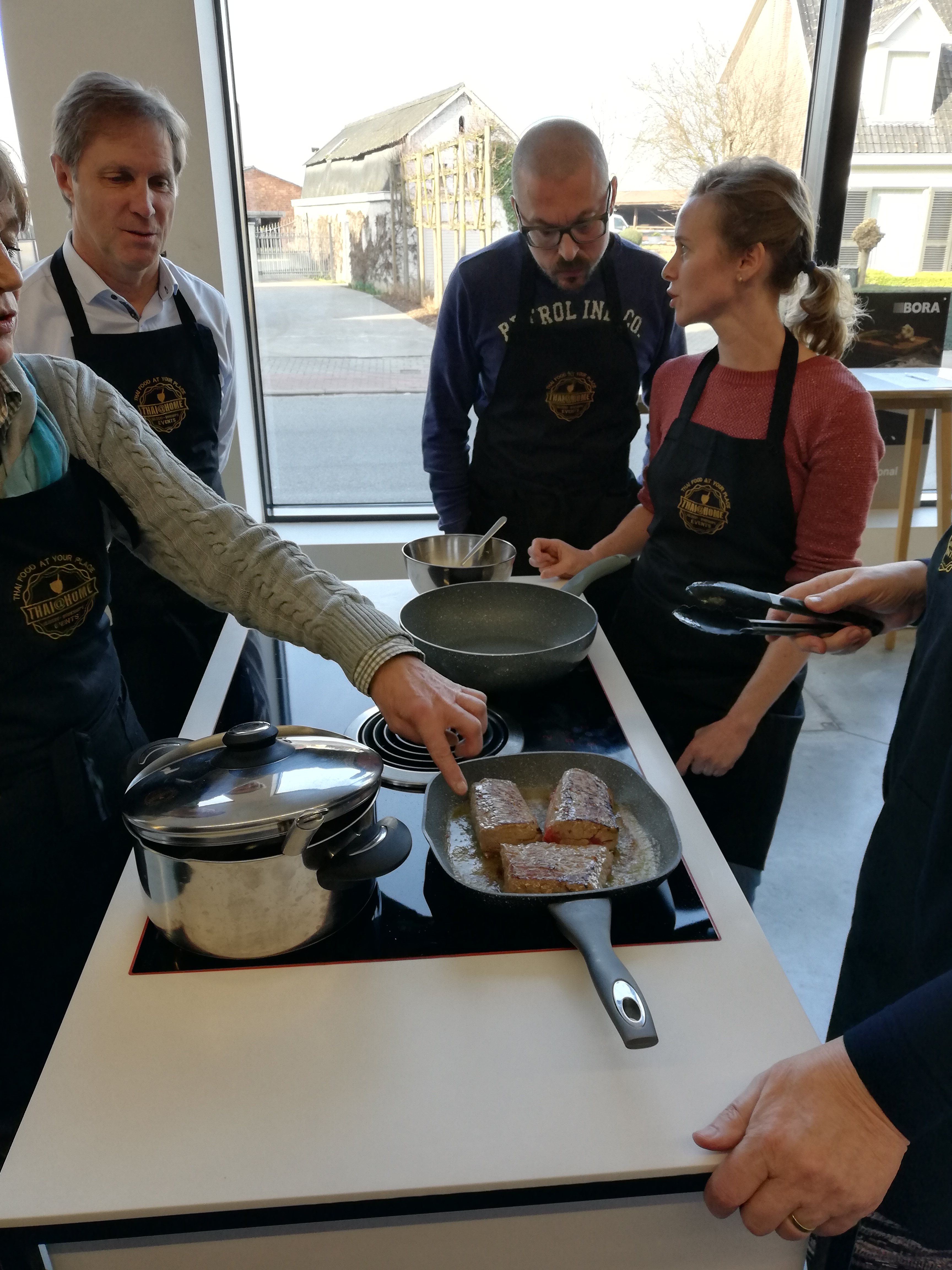 Steaks bakken op de kookplaten van Bora in de toonzaal van Kletz te Zele Saignant, blue, à point of bien cuit? Foto van mensen die rundsvleessteaks koken