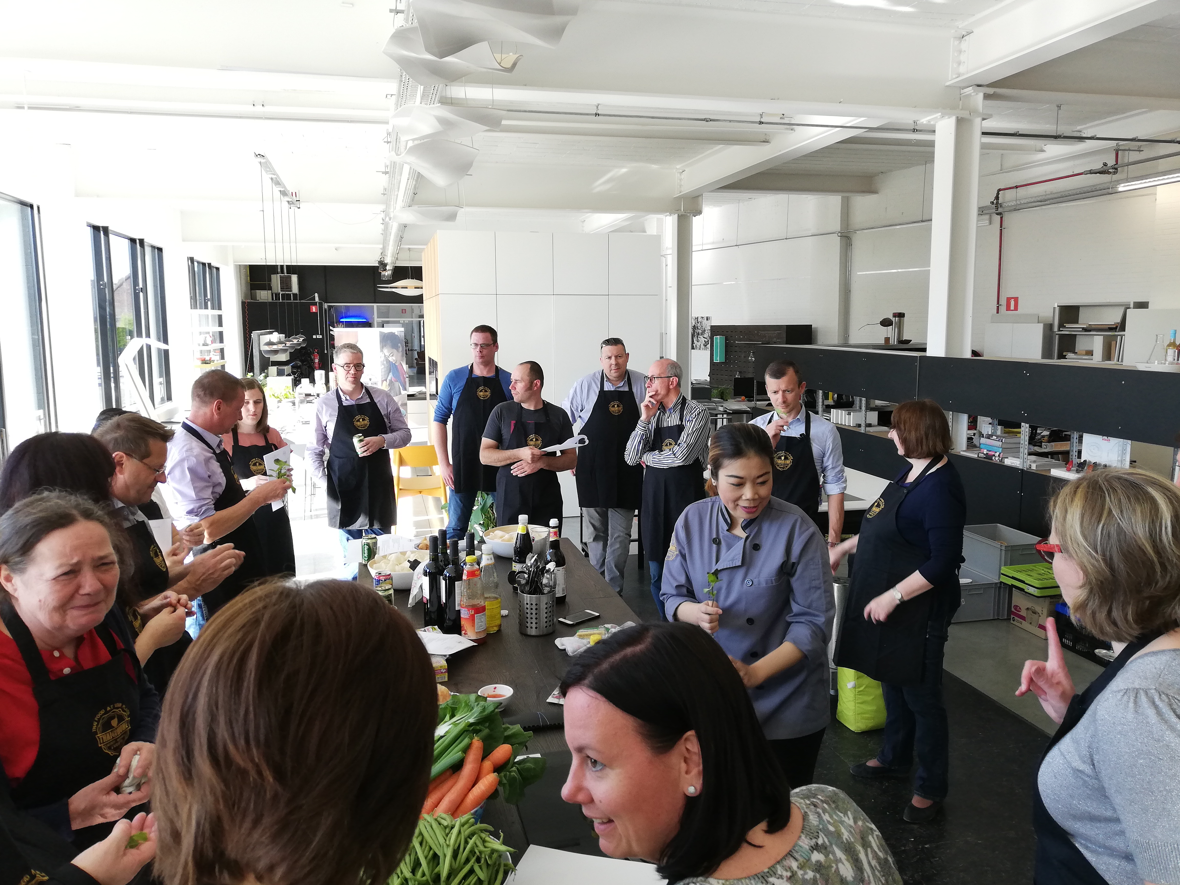 Ledent team te Hamme maakt zich klaar voor de Thaise kookles Veel plezier in de Thaise keuken Foto van mensen die luisteren voor Thaise kookworkshop