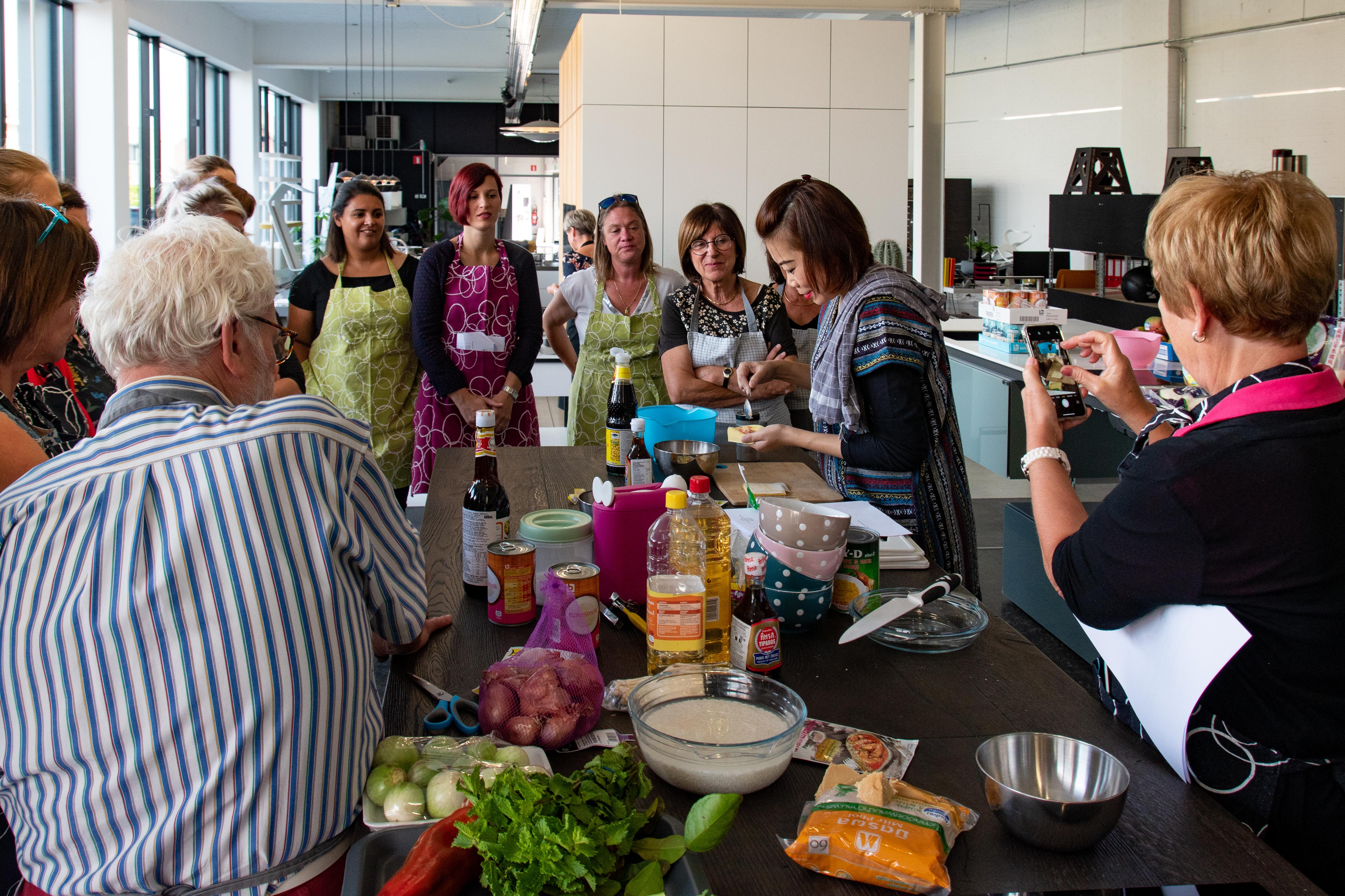 Thaise kookles in keukentoonzaal In de keukenles introduceren we de ingrediënten Foto van groep mensen die kookles volgt