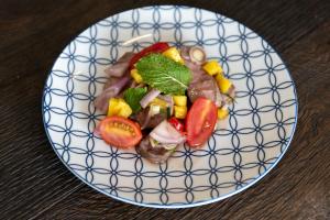 Foto van een bord met Thaise rundsvleessalade met mango