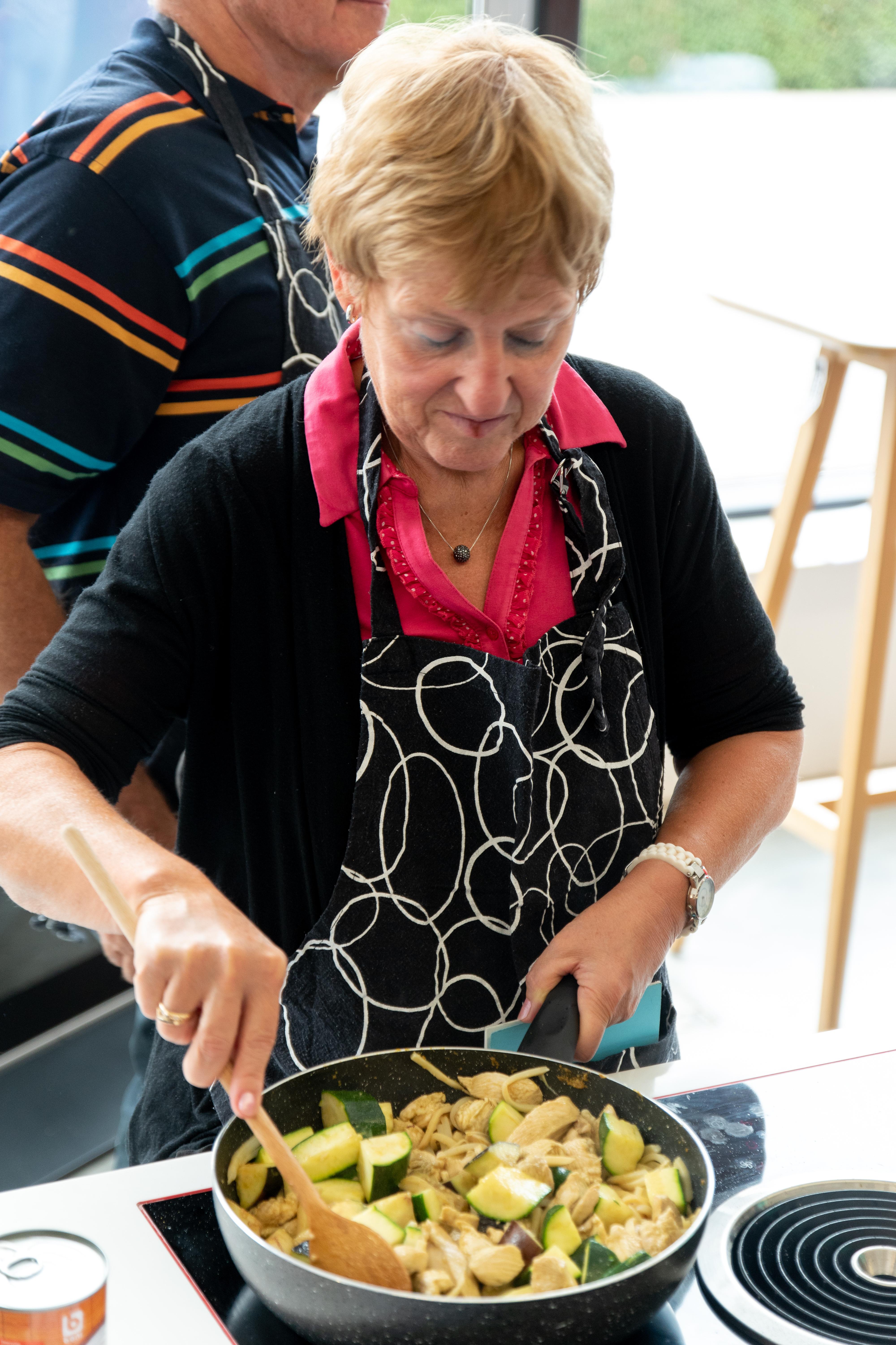 Thaiathome samen een curry maken Groen curry met Thaise aubergines en bamboescheuten Foto van een wok met groene curry